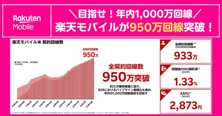 楽天モバイルの契約回線数が、ついに950万回線を突破しました(2025年11月7日時点)。 「赤字が大きい」「本当に大丈夫?」というイメージを持たれがちな楽天モバイルですが、最新の2025年度第3四半期(Q3/25)決算を見ると、状況は大きく変わりつ […]