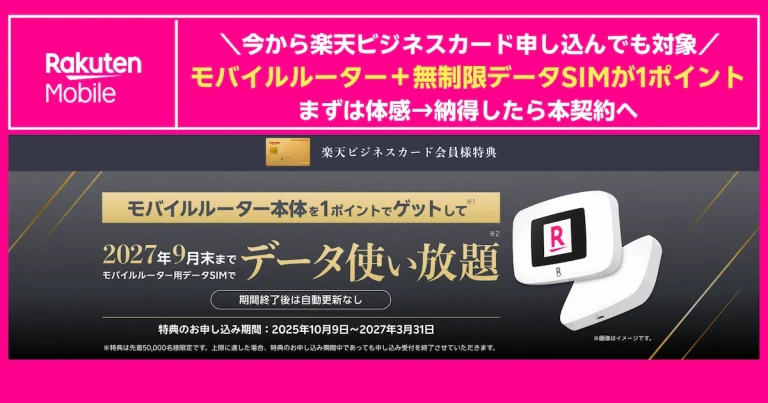 【楽天ビジネスカード会員様限定】この機会に、楽天モバイルの通信品質を“実機”でお試しください。 楽天ビジネスカード会員さま向けに、モバイルルーター本体(1ポイント購入)+データ無制限のモバイルルーター用SIMをセットで提供する特典がスタートしました。 […]