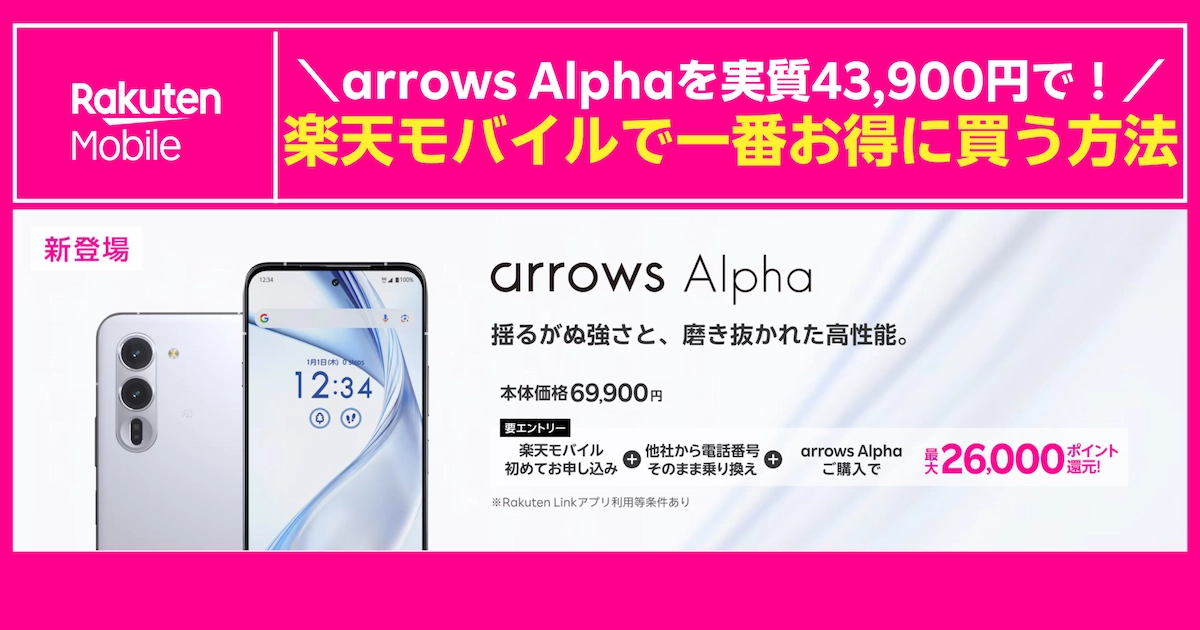 arrows Alphaは、ハイパフォーマンスCPUと大容量メモリ・ストレージを搭載した、FCNTの新しいフラッグシップAndroidスマホです。楽天モバイルでは端末価格69,900円(税込)ですが、キャンペーンを組み合わせると、最大26,000ポイント還元で実質43,900円(税込)まで価格を下げることができます。この記事では、「もっともお得にarrows Alphaを購入する手順」と、「条件別の実質価格の目安」を整理してご紹介します。