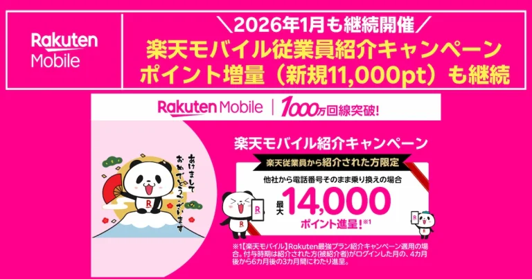 【2026年1月】楽天モバイル従業員紹介は新規11,000pt継続中(MNPは14,000pt)