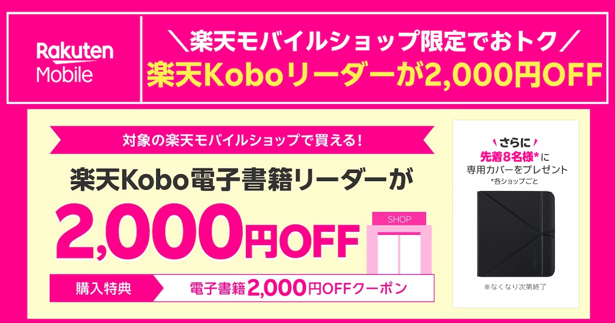 概要:対象の楽天モバイルショップで楽天Koboの電子書籍リーダーを店頭販売。本体2,000円OFFに加え、電子書籍2,000円OFFクーポンを進呈。さらに各ショップ先着8名に専用カバーをプレゼント。