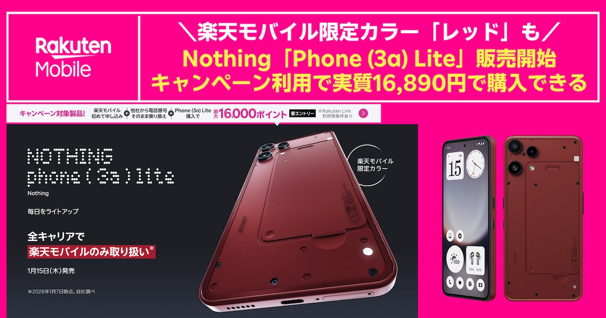 Nothingの新端末「Phone (3a) Lite」が楽天モバイルで予約受付を開始しました。国内携帯キャリアでは楽天モバイルのみ取り扱いで、限定カラー「レッド」も選べます。