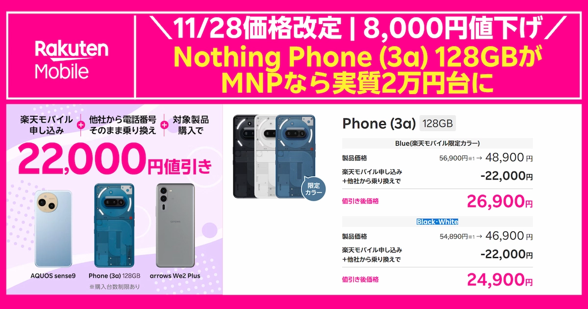 - 2025年11月28日から、楽天モバイルでPhone (3a) 128GBが8,000円値下げ