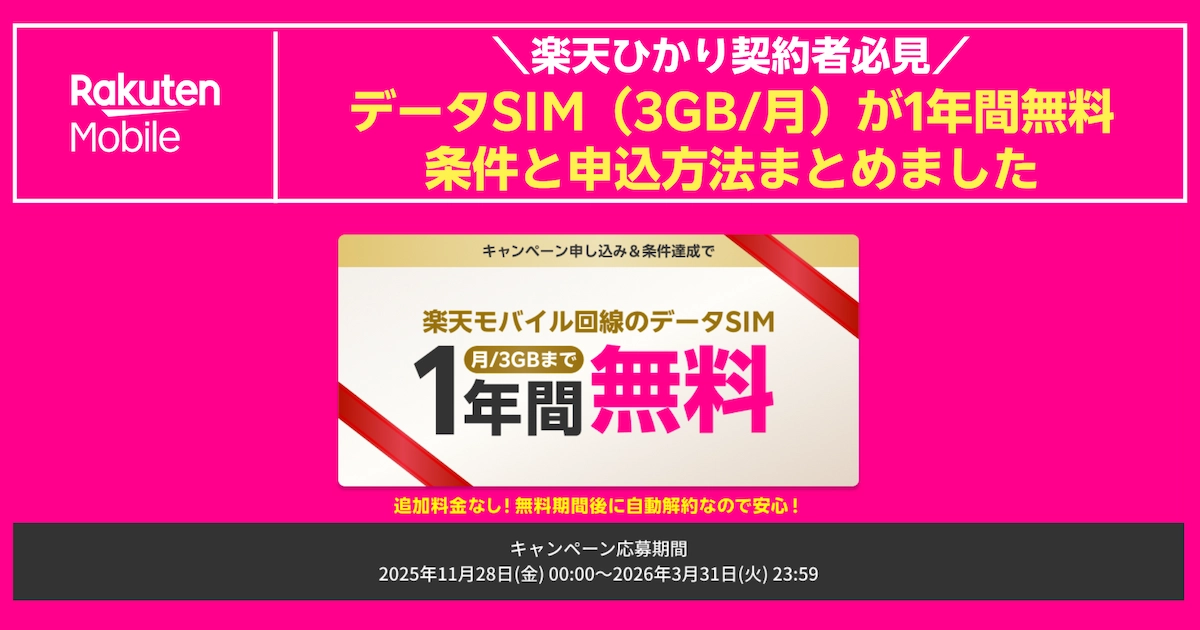 楽天ひかり契約者向けの「データSIM(3GB/月)1年間無料」特典は、条件を満たせば固定費の見直しに役立ちます。