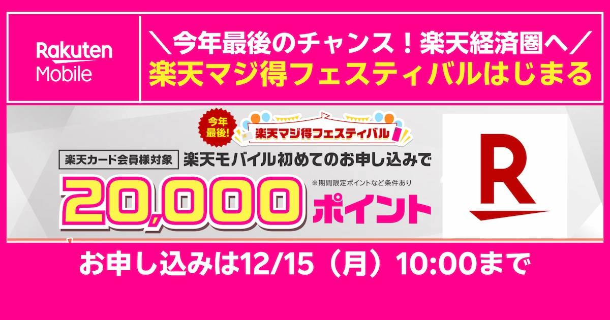 楽天カード会員の方向けに、楽天モバイルの新規契約がとてもお得になる「楽天マジ得フェスティバル!」がスタートしました。