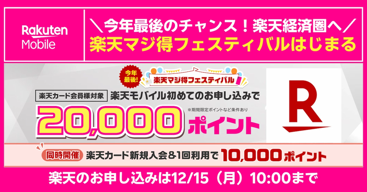 楽天カード会員の方向けに、楽天モバイルの新規契約がとてもお得になる「楽天マジ得フェスティバル!」がスタートしました。