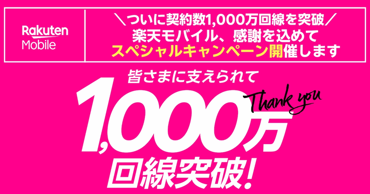 楽天モバイルは、2025年12月25日に契約数が1,000万回線を突破したと発表しました。サービス本格開始(2020年4月)から5年8カ月での到達とされており、この数字は私たちにとって大きな節目です。