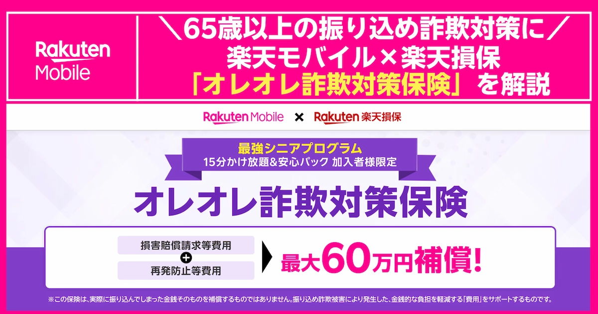 こうした状況を受けて楽天モバイルと楽天損保は、2025年12月1日(月)から、65歳以上の方向けの「最強シニアプログラム」をさらに強化し、「オレオレ詐欺対策保険」の提供を開始しました。