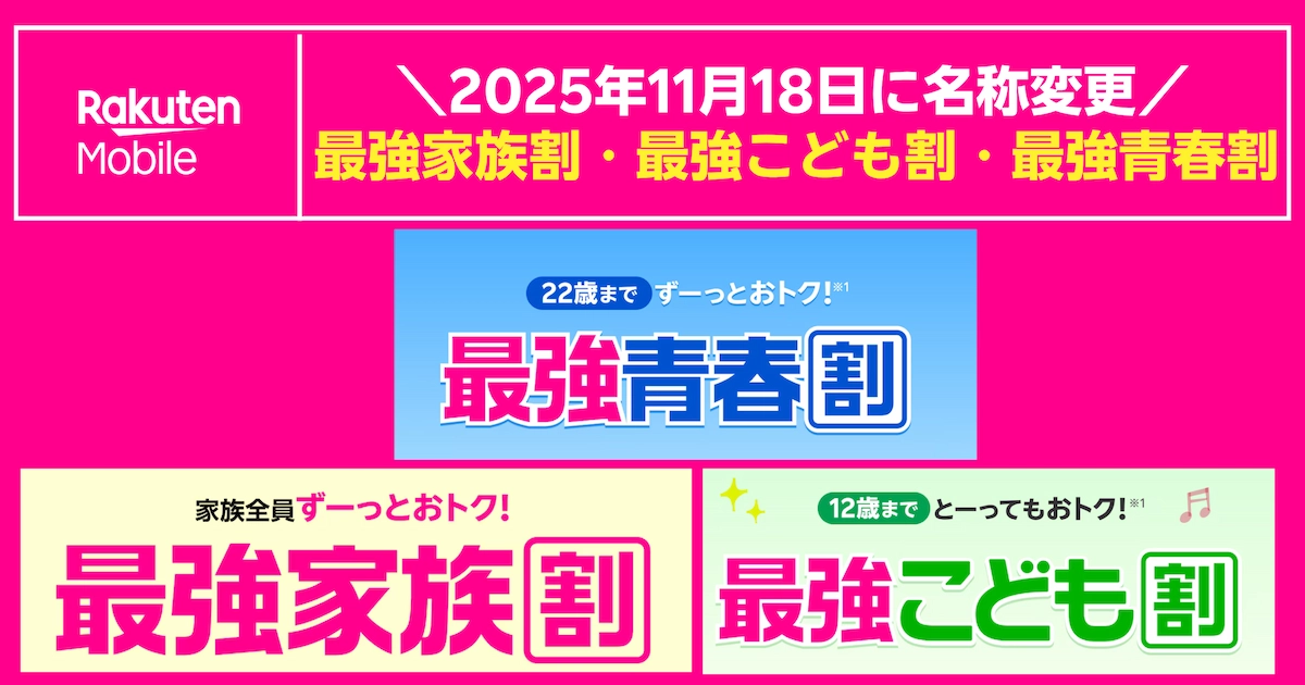 2025年11月18日から、楽天モバイルの割引プログラムがわかりやすい名称にリニューアルされました。