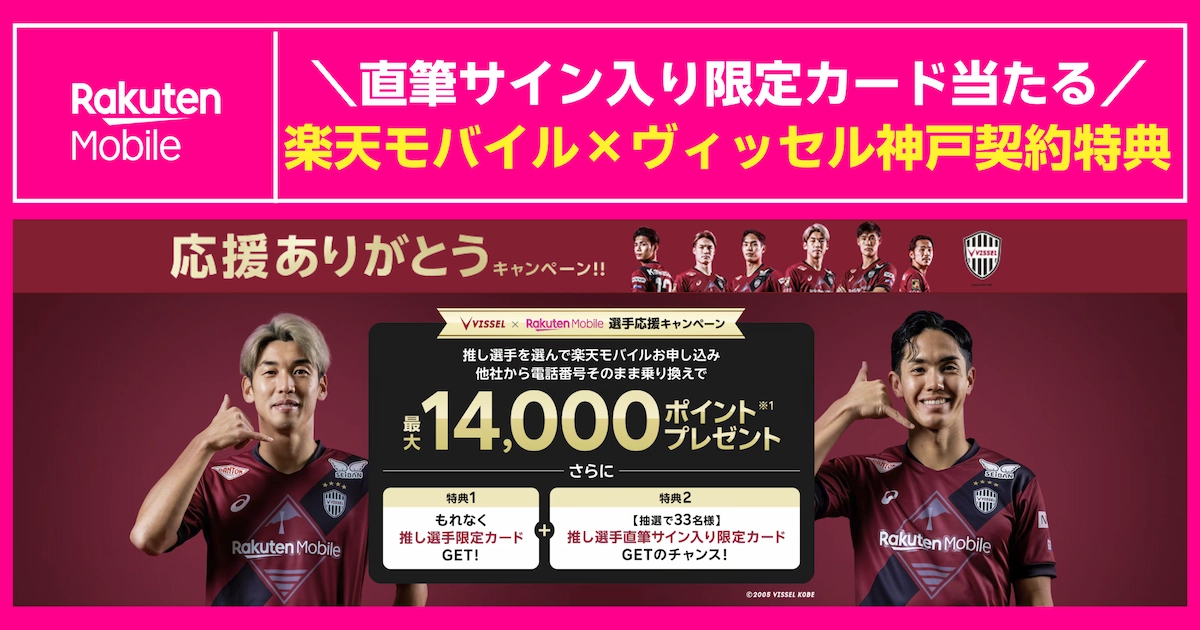 今回の「ヴィッセル神戸 選手応援キャンペーン」は、推し選手を選んで楽天モバイルへ申し込むことで、ポイント特典に加えて推し選手デザインの限定カードがもらえる企画です。さらに、抽選で直筆サイン入り限定カードが当たるチャンスもあります。